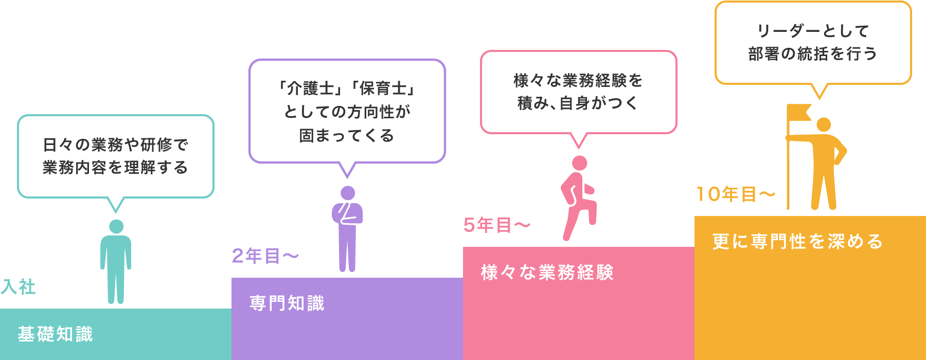 保育所では未来を担う子どもたちの情操を育み、老人ホームでは幸せな老後を過ごしていただくため日々私達にできることを考え仕事としています。